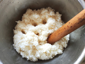 ![]() ⑪炊きあがったもち米はボールに移し、麺棒などでつついて半殺しにします。 |