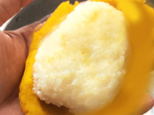 ![]() ⑫餅米を俵型に成形したら、同じくらいの分量の南瓜餡で包みましょう。 |