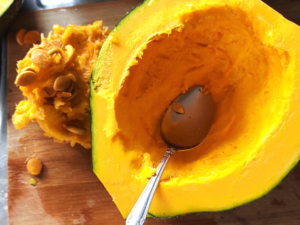 ![]() ③南瓜はスプーンなどで種とワタを取りましょう。 |