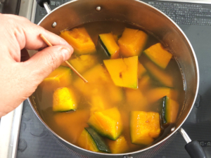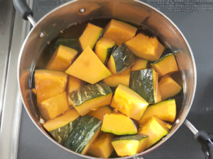 ![]() ⑤鍋に南瓜と浸るくらいの水を入れて、沸騰させ、沸騰したら、弱火で6~7分ゆでましょう。 |