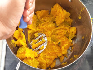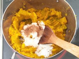 ![]() ⑧砂糖とシナモンを南瓜に加え、木べらで練り混ぜます。 ⑨水分が多いようなら、弱火に数分かけ、餡子くらいの固さにしておきましょう。 |