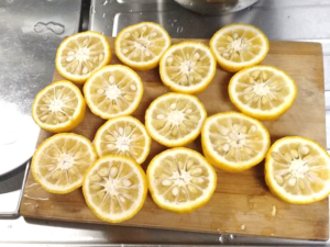 ![]() ①ゆずは、皮をお湯で良く洗い、横半分に切ります。 |
