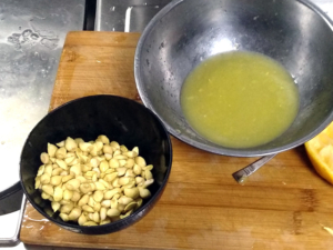 ![]() ②種を小さいフォークなどで取り出し、手でぎゅっと握って、果汁を絞っておきます。 |