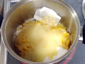 ![]() ⑦鍋に皮を戻し入れ、砂糖と果汁、お茶ポットに包んだ種(15~20粒)を入れて火にかけます。 |