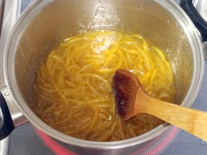 ![]() ⑤鍋に刻んだ皮とひたひたの水を入れて火にかけ、沸いたら捨てます。 ⑥二度ゆでこぼしを繰り返してから、しっかりと水気を切りましょう。 |