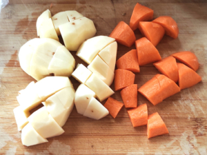 ![]() ①じゃがいもは皮をむいて一口大に切り、人参も皮をむいて小さめの乱切りにします。 ②耐熱皿にじゃがいもと人参を並べ、ラップをして7~8分加熱しておきましょう。 |