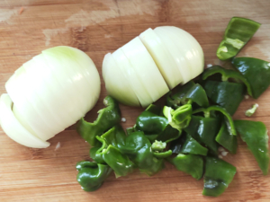 ![]() ③玉ねぎは皮をむいてくし形に切り、ピーマンは種とヘタを取って乱切りにします。 |