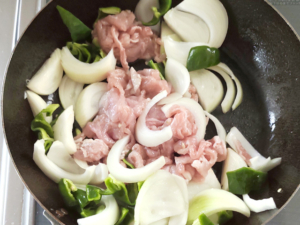 ![]() ⑤食べやすく切った豚こまと玉ねぎ、ピーマンをフライパンに入れ、豚肉が完全に白くなるまで火を通しましょう。 |