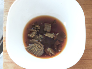 ![]() ⑥器に酒、醤油、小さく刻んだカレールーを入れて軽く混ぜます。 |