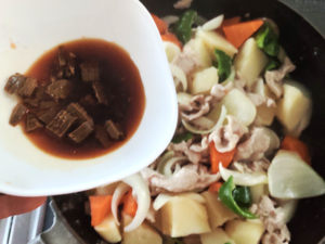 ![]() ⑦レンジからじゃがいもと人参を取り出し、フライパンに加えたら、カレールー液を加え、全体をざっくりと混ぜます。 ⑧カレールーが全体にいきわたればOK。 |