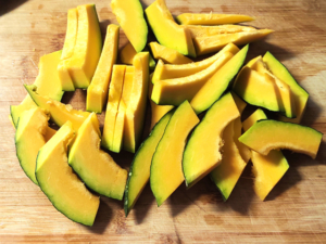 ![]() ①かぼちゃは種とワタを取り、7mm厚さにスライスします。 |