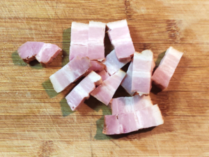 ![]() ⑤ベーコンブロックは、1cm幅の拍子切りにします。 |