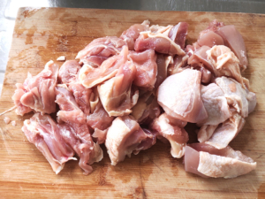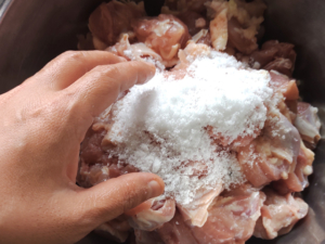 ②ボールに鶏肉を入れ、砂糖を手でもみこみましょう。