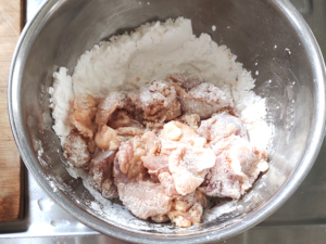 ④肉の水気を切り、片栗粉を薄くまぶしておきましょう。