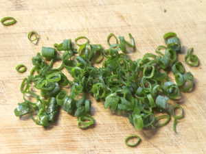 ⑩器にご飯とチリソースを絡めたザンギを盛りつけ、ねぎを散らし、温泉卵を乗せたら、完成です。