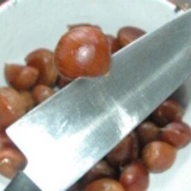 ![]() ②栗のとがっている部分に、包丁で1cm深さの切り込みを入れましょう。 |