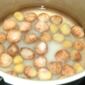 ![]() ①栗をたっぷりの水に、10分漬けこみます。 |