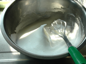 ![]() ①卵白に砂糖をひとつまみ加えて泡立て始め、クリームくらいの硬さになったら、残りの砂糖を二回に分けて加え、ピンと角が立つまで泡立て、メレンゲを作ります。 |