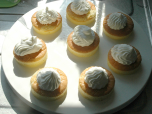 ![]() ⑪冷めたケーキ生地をセルクル(今回は6㎝)などでくりぬきます。 |