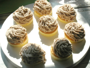 栗の渋皮煮を作ったので、ミニサイズのモンブランケーキにしてみました。ちょっと固めの渋皮煮でも、裏ごしすれば、クリーミーになります。秋の味覚を楽しんで下さい。