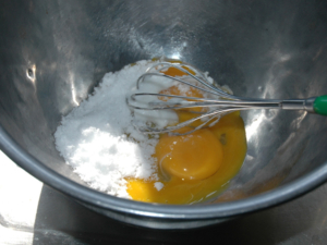 ![]() ②卵黄のボールに卵黄用の砂糖を全量加え、もったりとして白くなるまで泡立てましょう。 |