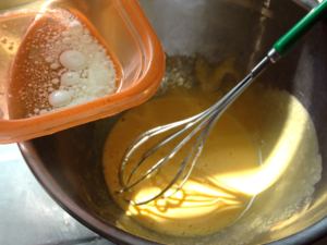 ![]() ③牛乳とサラダ油を一緒にレンジで20秒ほど温め、卵黄のボールに少量ずつ加え、その都度良く混ぜ合わせます。 |