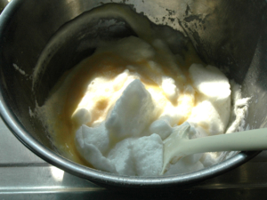 ![]() ⑤卵黄のボールの中身を卵白のボールに全量入れ、ゴムべらに持ち替えてさっくりと練らないように混ぜましょう。 |