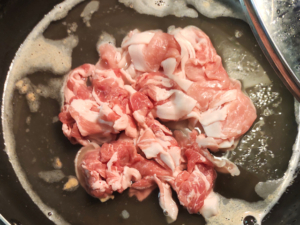 ![]() ②調味料が溶けたら、豚肉を加えて、白くなるまでしっかりと火を通しましょう。 (途中かき混ぜると、早く火が通ります。) |