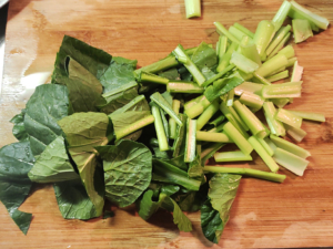 ![]() ③小松菜は泥汚れをしっかりと落とし、5cm幅くらいのざく切りにします。 |