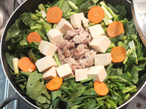 ![]() ④鍋に豚肉を中央に寄せて、周囲を小松菜で覆い、中央には豆腐を食べやすく切ったものを乗せ、人参の薄切りも散らします。 |