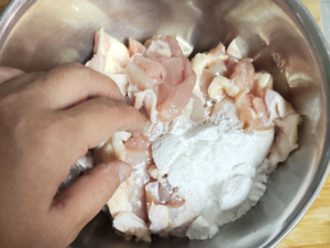 ![]() ④違うボールに鶏肉と片栗粉を入れ、全体に薄く粉をまぶします。 |