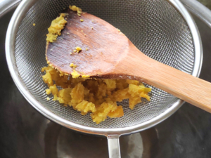 ![]() ④かぼちゃが柔らかくなったら、熱いうちに裏ごしをしましょう。 |