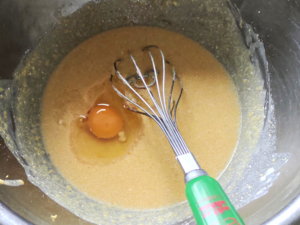 ![]() ⑥卵も1個ずつ加え、その都度よく混ぜます。 ⑦生地がなめらかになったら、プリンはOK。 |