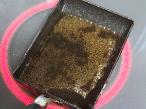![]() ⑧フライパンにカラメルソース用の砂糖、水を入れて混ぜ、強火にかけましょう。 ⑨茶色く色づいたら火を止め、お湯を注ぎ入れて、軽く混ぜ合わせます。 (はねるので火傷には注意してください。) |
