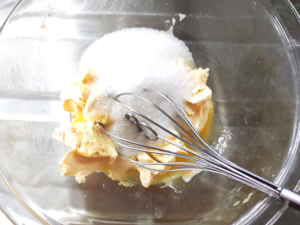 ![]() ②耐熱ボールにマーガリンを入れ、ラップをせずにレンジで20秒ほど加熱し、柔らかく(マヨネーズ程度)しておきます。 ③グラニュー糖を加え、白っぽくふわふわするまで混ぜましょう。 |