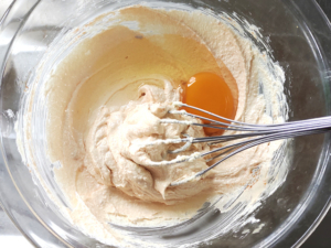 ![]() ⑤卵を一個加えてよく混ぜ、残りの卵は溶いてから少しずつ加えて混ぜます。 |