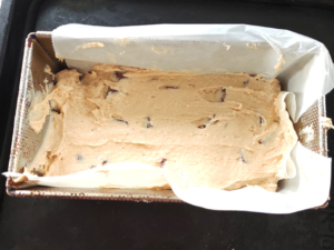 ![]() ⑧パウンド型にオーブンシートを敷き、生地をすくい入れ、表面を平らにならします。 |