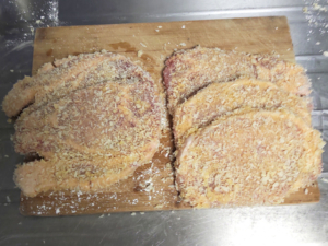 ![]() ②豚肉に、薄力粉→溶き卵→パン粉の順に衣をつけましょう。 |