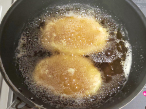 ![]() ③180度の油で、表面がきつね色になるまで揚げます。 (裏表で、3分ずつくらいが目安です。) |