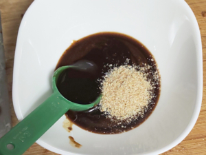 ![]() ④容器に、お好み焼きソース、トンカツソース、にんにく、白ごまを混ぜ合わせてソースを作りましょう。 |