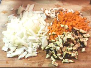 ![]() ①玉ねぎと人参は皮をむいてから粗みじん切りに、椎茸とナスも粗みじん切りにします。 |