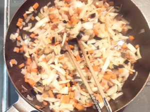 ![]() ②フライパンに大2~大3の油(分量外)を引き、切った野菜を炒めましょう。 ③玉ねぎが透き通ればOKです。 |