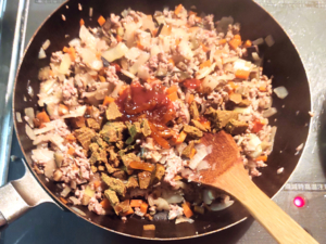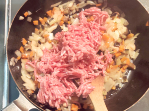 ![]() ④ひき肉もフライパンに加え、木べらで切り崩すように炒め、白くなるまで完全に火を通します。 |