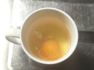![]() ⑥マグカップに水を8分目くらいまで入れて中に卵を割り入れ、つまようじで卵黄に5~6か所穴をあけましょう。 ⑦ラップをしないでレンジで1分10秒ほど加熱し、茶こしなどで水分を切って、温泉卵を作ります。 |