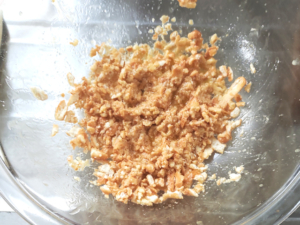 ![]() ①クラッカーは袋に入れて砕き、土台用マーガリンをレンジで20秒ほど加熱して溶かし、クラッカーとよく混ぜ合わせます。 |