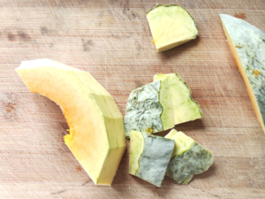 ![]() ④かぼちゃは種とワタを取り、皮も包丁で切り落とし、小さめの一口大に切ります。 |