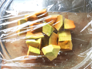 ![]() ⑤耐熱ボールに一旦水にくぐらせた南瓜を入れ、ふんわりとラップをして、8分ほど加熱します。 ⑥竹串がすっと通るくらいの柔らかさになったらOKです。 |