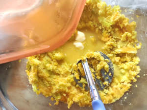 ![]() ⑦かぼちゃは熱いうちに、マッシャーなどで細かくつぶし、生地用のマーガリンをレンジで溶かした物を加えてよく混ぜます。 |