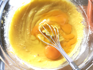 ![]() ⑨ミキサーの中身をボールに移し、卵を加えてよく混ぜます。 |