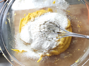 ![]() ⑩薄力粉をボールにふるい入れ、泡だて器で粉っぽさがなくなるまで混ぜましょう。 |